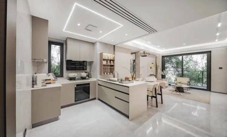 双面加宽组合型岛台,岛台长度从传统的60mm拓展至90mm,拓展操作空间;其他像预留双开门冰箱位、灶台背面大板砖、顶面线性灯+凉霸等人性化品质细节,也都是交付标准!