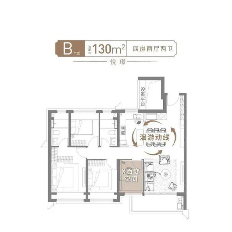 全景面宽+无界通厅+高的附加价值+收纳天花板,130㎡的面积直逼140㎡的尺度感!